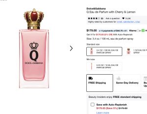 原价$175! .3 盎司淡香水喷雾 + 0.33 盎司淡香水喷雾, Q by Dolce&Gabbana 是一款以果香为主调、并辅以浓郁木质基调的香氛。西西里柠檬的清新气息,与樱桃那对比鲜明的酸甜滋味巧妙融合,赋予了这款香水一种既精致又大胆的独特香气