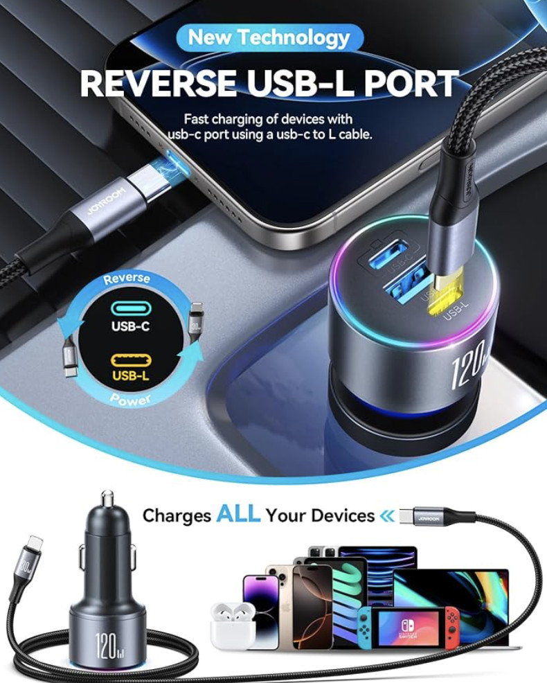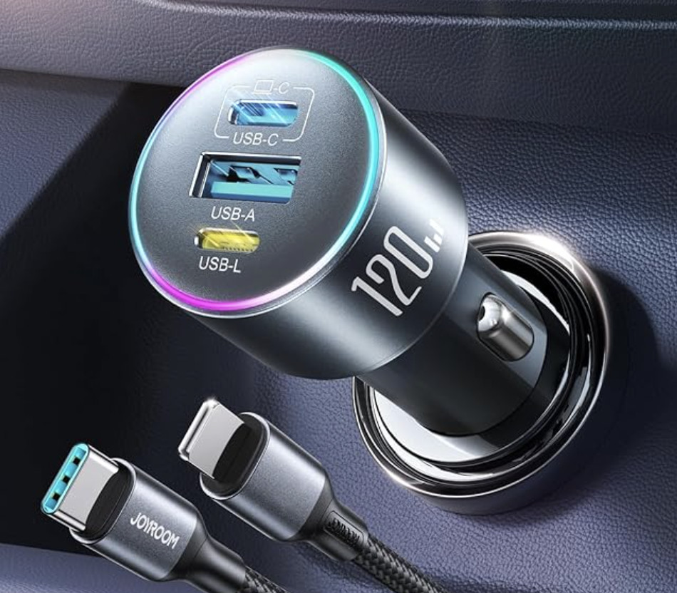 原价$15.59! JOYROOM 120W 超快车载充电器支持 PD 3.0、PPS 和 QC 3.0 快充协议,完全兼容所有设备。这款 USB-C 车载充电器可在 30 分钟内将 iPhone 17 充电至 85%,并在两小时内将 MacBook/iPad Air 充电至 80%, 独特的充电接口,让您的家人或朋友在使用 iPhone 5/6/7/8/11/12/13/14/15/16/17 系列手机时,可以借用这款充电器为他们的设备充电, 同时支持 Type-C 和 USB-L 接口的设备, 解决了设备没有数据线的问题, 让您在旅途中也能随时保持设备满电状态