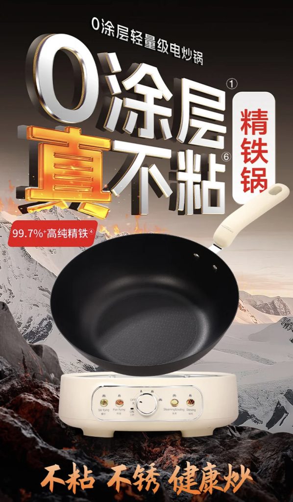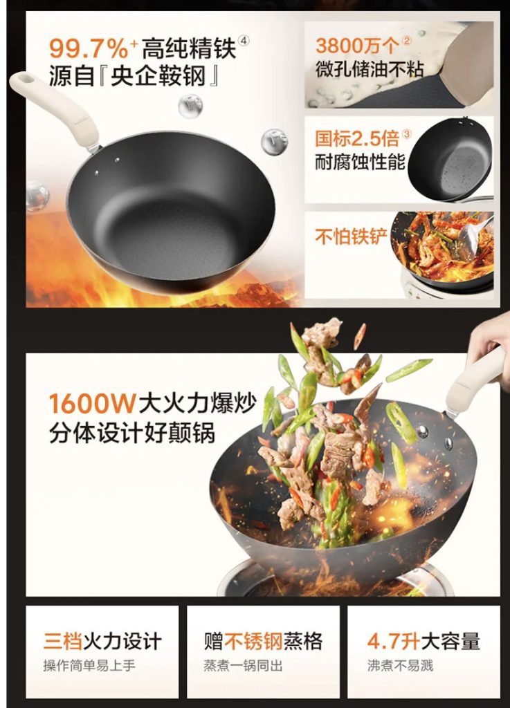 原价$163.5! 铁0涂层多功能炒锅,蒸煮焖炒随心烹饪, 不锈不粘,硬壳食材放肆炒,煎鱼不粘皮焦肉嫩, 三档火力,随心掌握锅中滋味, 搭配蒸锅,蒸出原味香,尽享健康味, 4.7升大容量,一锅炒出全家美味, 分体设计,端拿轻松,拆洗方便,收纳省心