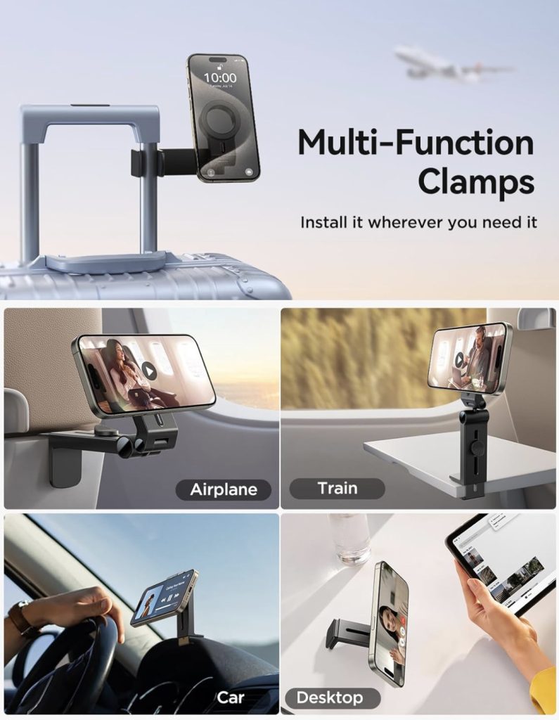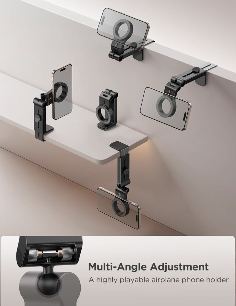 原价$19.99! 飞机手机支架具有 20 个强力永磁体,旨在与 MagSafe 技术无缝交, 。当手机靠近旅行手机支架时,可以牢固地固定, 具有可折叠功能,体积小巧,便于随身携带。您可以将其放入背包或手提箱中, 无论您身在何处,都可以将其安装到汽车、桌盘、行李箱把手、桌面、床、厨柜、架子、椅子等上, 具有 360° 球头和旋转设计,可让您轻松将设备放置在理想​​的视角