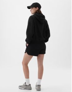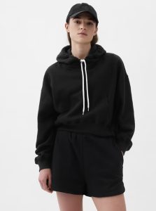 原价$59.95!柔软的棉混纺短款连帽衫, 连帽领口配有抽绳,长袖,落肩和带状袖口,前袋鼠口袋,弧形带状下摆