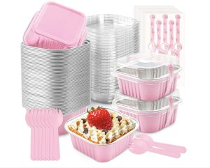 50 Pcs Mini Cake Pans with Lids and Spoons Aluminum Foil Mini Square Baking Cups with Lids Disposable Ramekins Cake Pans Dessert Cups for Wedding Birthday Party(Pink,5oz)