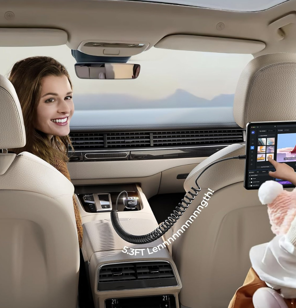 原价$24.99! 60W 多端口充电器适配器可同时为四台设备充电, 配备 USB C(30W PD3.0)端口、双 USB A(18W QC3.0)端口和 5 英尺 C 型 30W 快速充电线。让您的所有家庭成员不再担心没有足够的充电器充电, 当电缆盘绕时,它占用的空间很小,并保持汽车整洁, 延伸时可达到仍可使用手机所需的距离, C型车载充电器还配有多色灯,夜间驾驶时可以轻松找到充电位置, 内置智能安全芯片,通过UL,FCC,CE,RoHS等认证,具有过流,过压,短路,过温,过功率,欠压等多重安全保护功能