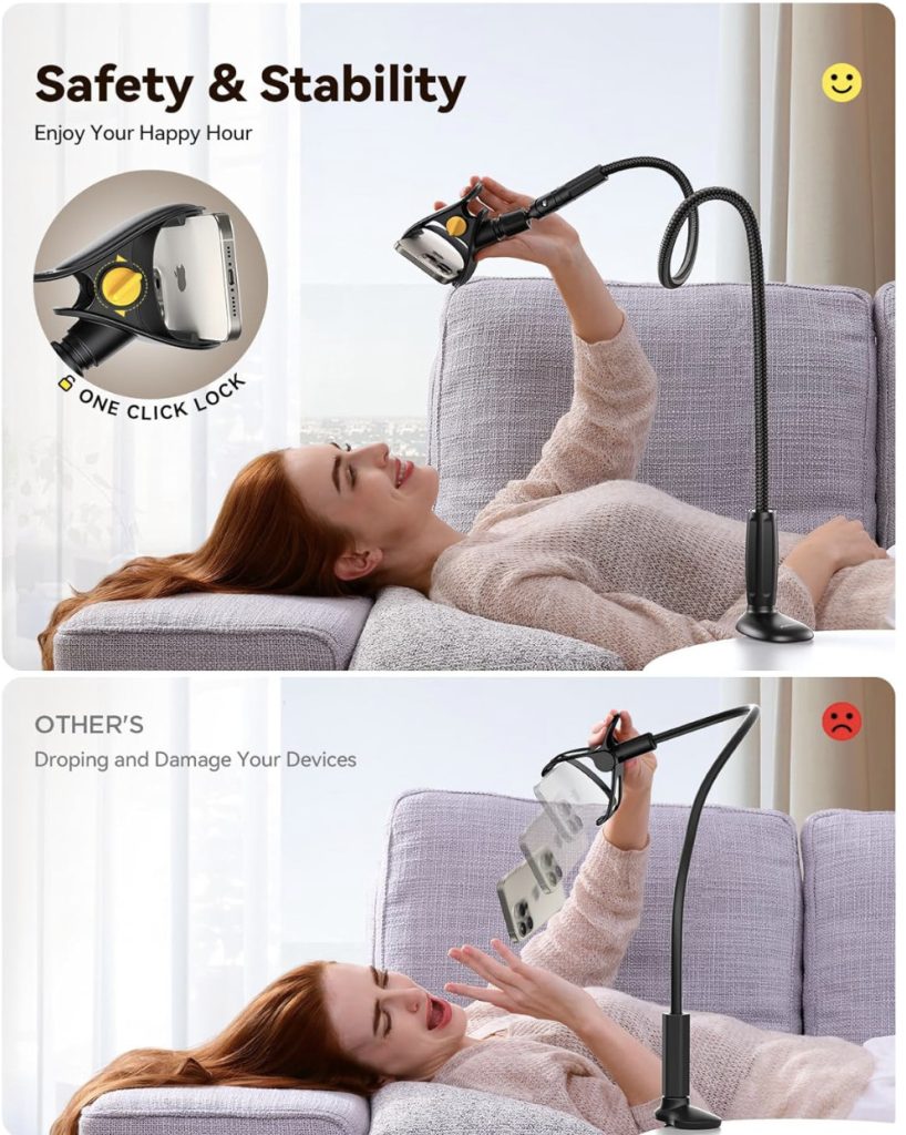 原价$28.99! 鹅颈式手机支架的创新安全锁和柔软硅胶垫即可将您的设备牢固地夹在支架上, 360° 旋转球的鹅颈式手机支架, 增加了一个可调节接头,这一独特功能使我们的支架更加灵活方便,无需每次都弯曲整个蛇颈, 720° 全角度调节,可将您的设备牢固地固定在您想要的精确位置, 具有从 0 到 3.15 英寸(8 厘米)不等的旋入式夹紧底座,可弯曲的手机夹支架可以牢固地安装在床架、床头柜、床头柜、床头板、书桌、茶几、椅子和厨房柜台等的边缘, 贴心的橡胶垫可保护您的桌子免受划伤并防止滑落