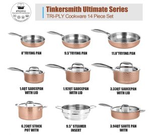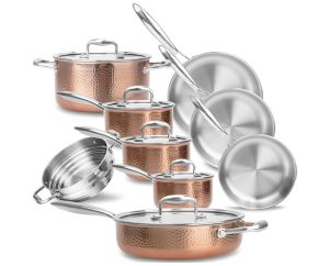 原价$599.99! 这款锤纹不锈钢锅具采用2.5毫米厚的三层复合设计,确保多年烹饪过程中不变形。采用耐腐蚀的食品级不锈钢制成,无涂层,无论是煎炸、烘焙、烧烤还是蒸煮,都不会剥落到食物中或影响口感。绝对安全,呵护您家人的健康, 采用三层结构,内含纯铝内芯,导热性能卓越。imarku独特的热环绕技术确保锅底和锅壁快速均匀受热, 适用于几乎所有炉灶,包括电磁炉、陶瓷炉、燃气炉和电炉, 不锈钢炊具套装的手柄符合人体工学设计,采用牢固的铆钉设计,确保最佳平衡性,并配有气流系统