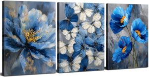 Blue Butterfly Wall Art Flower Wall Decor Abstract White Butterfly Pictures Blue and Gold Poppy Floral Canvas Prints Rustic Farmhouse Botanical Artwork Living Room Bathroom Home Decoration 12×16″ 3Pcs