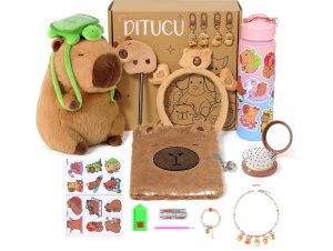 Ditucu Turtle Capybara Plush Gifts for Girls 4 5 6 7 8 9 10 Years Old with Stuffed Animal/Stickers/Water Bottle/Keychains/Diary/Pen/Headband/Comb/Necklace/Bracelet Plushies Toys Set