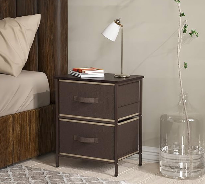 原价$26.87!完美的床边组织,这个床头柜有两个织物抽屉存储个人物品,书籍,和夜间必需品。采用耐用的钢框架和透气的织物抽屉,提供稳定性,同时保持易于移动或重新定位。