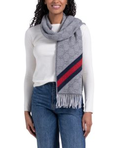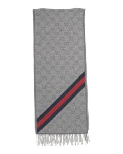 原价$400, 这是 GUCCI围巾由羊毛制成,背景上印有经典的 Gucci GG 字母图案,并饰有织带条纹细节。舒适又时尚!