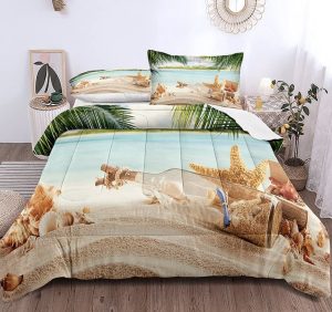 原价$45.99! 面料由 100% 超细纤维制成。被子填充物为 100% 涤纶, 超柔软的材质让您四季都感到温暖舒适, 被子蓬松轻盈, 不会对您的身体造成向下的压力。, 这种柔软透气的面料有助于您舒适地睡眠, 沿海海洋生物图案让您的卧室更具吸引力,海滩主题的被子颜色非常均匀自然,不会褪色