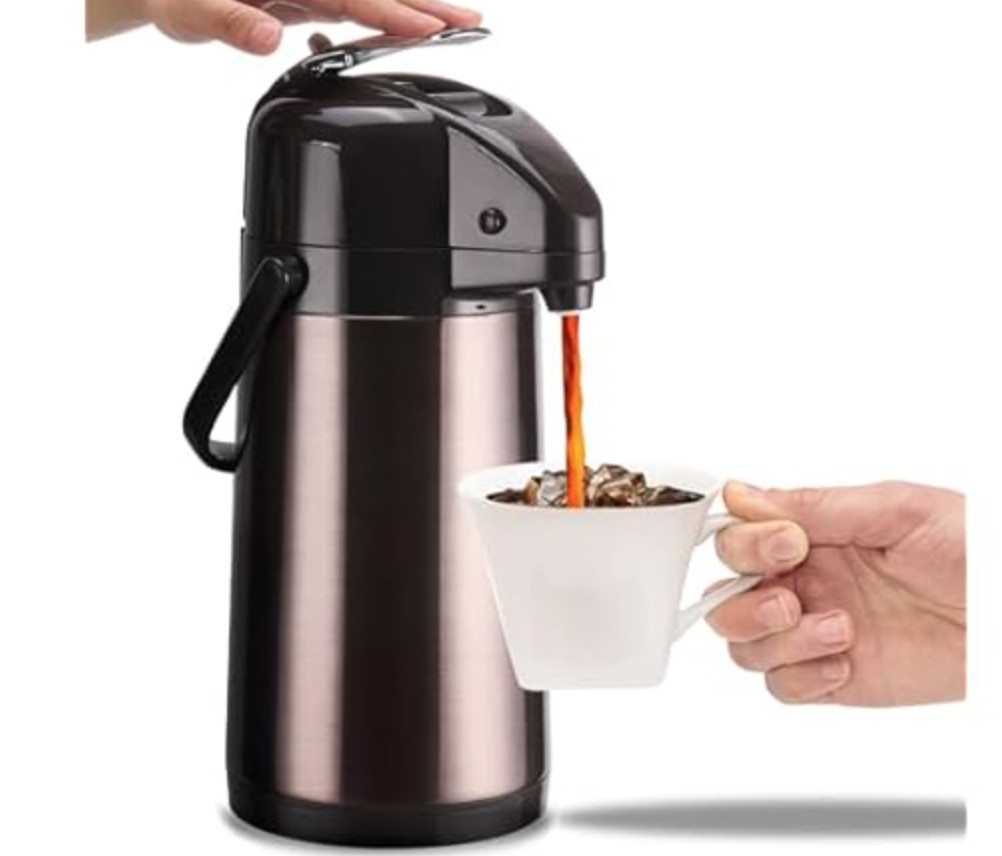 原价$49.99!!升级版机场咖啡壶,双泵设计,容量 84 盎司/2.5 升,不锈钢材质,带旋转底座,适用于热饮/冷饮,适合聚会时使用,咖啡保温杯,适合制作热可可饮品。食品级 316 不锈钢材质,保持热态长达 24 小时,保持冷态长达 36 小时。适用于任何季节!