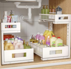 原价$49.99! 收纳盒底部篮筐尺寸为 15.8 英寸 x 10 英寸,顶部篮筐尺寸为 15.8 英寸 x 6.5 英寸,与标准产品相比,存储空间增加了约 30%, 提供了更多的空间,可以让您的物品整齐有序、方便取用。, 采用双层拉出式设计,让您轻松取用最深处的物品。升级的加厚铁制圆形滑轨确保顺畅无缝的拉动体验,让每次使用都毫不费力, 独特的拉出锁定机制有效防止抽屉被完全拉出,避免了物品掉落或因过度拉动而造成结构损坏的风险,确保使用更安全、更便捷