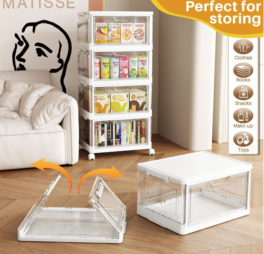 原价$31.99!!便于存放和运输,节省空间。非常适合用于可堆叠的储物抽屉。具有四个储物层,配有盖子和轮子,便于移动。非常适合用作塑料储物箱和带盖子的透明储物箱。适用于家庭、办公室、浴室、洗衣房等。也非常适合用作玩具存储整理盒和带盖子的储物箱
