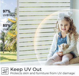 原价$9.99! 96% 隐私保护同时让柔和的自然光充满您的家,  窗户隐私膜的经典条纹图案营造出时尚精致的外观,让人联想到内置百叶窗,为您的家庭或办公室窗户增添光彩, 阻挡 97% 的有害 UVB 射线和 85% 的 UVA 射线,保护您的家具免于褪色,同时仍允许柔和的自然光线透过, 使用静电吸附在您的窗户上, 无需粘合,使用方法简单,易于去除