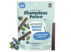 原价$10.35! Shameless Pets 的这款 The Tooth Berry 洁齿棒,能帮助爱犬保持洁白牙齿,清新口气, 带有棱纹,能够深层清洁牙齿,并添加了关键的再生原料,以支持爱犬的整体健, 。一袋8根, 采用真正的蓝莓和薄荷制成,不含谷物、玉米和大豆,同时富含健康的本地食材, 所有年龄、体型和品种的狗狗都可以享用!