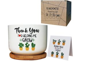 原价$6.99!白色陶瓷盆印有“Thank You For Helping Me Grow”字样,搭配竹质托盘,简约温馨,尺寸适合种植小型多肉植物,礼盒包装,无需二次包装,送礼更有心意。