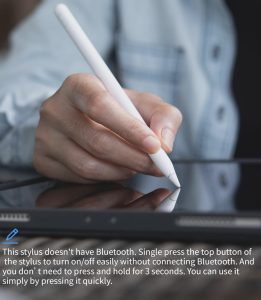 原价$9.66! 此款触控笔不具备蓝牙功能。单击触控笔顶部按钮即可轻松开机/关机,无需连接蓝牙, 1.5 毫米笔尖可处理更精细的细节,不会出现延迟、中断或跳动,比被动式触控笔更灵敏。倾斜感应技术允许您根据 iPad Pencil 的角度在屏幕上绘制不同粗细的线条,使书写和绘画更加自由