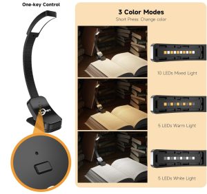 原价$14.99! 支持 3 种照明颜色——琥珀色光(1600K)、暖白光(4000K)和白光(6000K)。阅读灯底座上只有 1 个按钮,短按按钮可更改照明颜色。书灯配备 10 个升级的 SMD LED(5 个琥珀色 LED 和 5 个白光 LED),其寿命超过 50,000 小时,比普通 LED 发出更均匀的亮度, 支持无级调光,长按书灯底座上的按钮可无级调节亮度, 具有记忆功能,它会记住您的首选设置, 具有 360° 可调节颈部,可旋转到您想要的任意角度