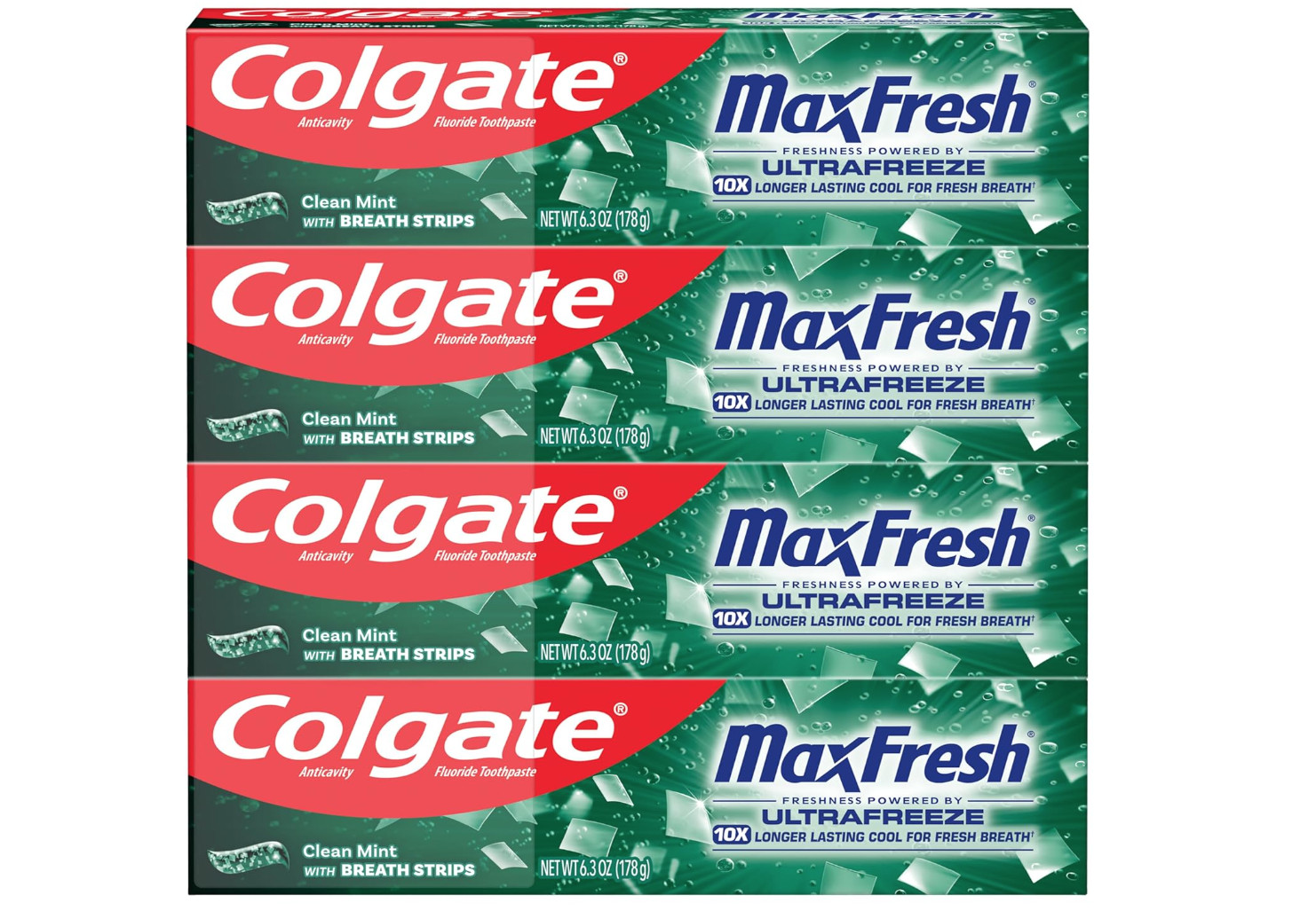 原价$13.99!!四支6.3盎司的高露洁清新美白牙膏,清洁薄荷,口气清新牙膏包提供持续数小时的清新,高露洁Max Fresh牙膏比领先的含氟牙膏提供10倍的持久凉爽,数以百计的迷你呼吸条,释放出强大的新鲜感,持久清新的口气~