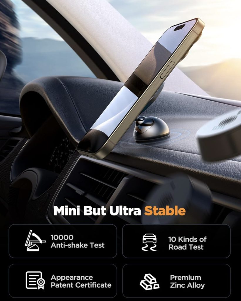 原价$29.99! 采用优质锌合金材料,比其他 iphone magsafe 车载支架更耐用、更坚固, 内置 20 个超级磁铁,磁力是普通车载手机支架磁力的 2 倍,可以安全支撑 10 个 iPhone 14 Pro Max 的重量, 采用独特的 3M 粘合剂,还增加了底座面积以获得更强的粘合力, 即使在-40°F至194°F的极端环境下,这款iPhone磁性车载手机支架也能紧紧粘在您的汽车仪表板上!柔性金属球头支持水平360°和垂直85°调节