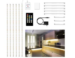原价$20.99! 可调光橱柜灯,适用于厨房的插入式LED灯带,6条预切LED灯带。白色橱柜灯,适用于DIY厨房、橱柜、衣柜、台面、搁架、电视背面、展示柜等任何您想要的地方, 可调光LED橱柜灯,适用于厨房。超亮灯带,2700 K-6500 K自然光,亮度可调。可用于橱柜照明、台面照明,照亮您厨房的每个角落, RF遥控+触摸控制, 超强穿透力的RF遥控器具有多种功能,包括调光、定时关闭、五种动态功能和三种场景模式。调光器具有记忆功能,可将上次设置保存在内存中