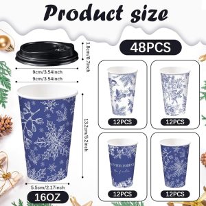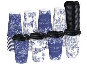 RUSPEPA Disposable Paper Coffee Cups with Lids 16 oz – 48 Pack Christmas Blue and White Design Printed Paper Drinking Cups