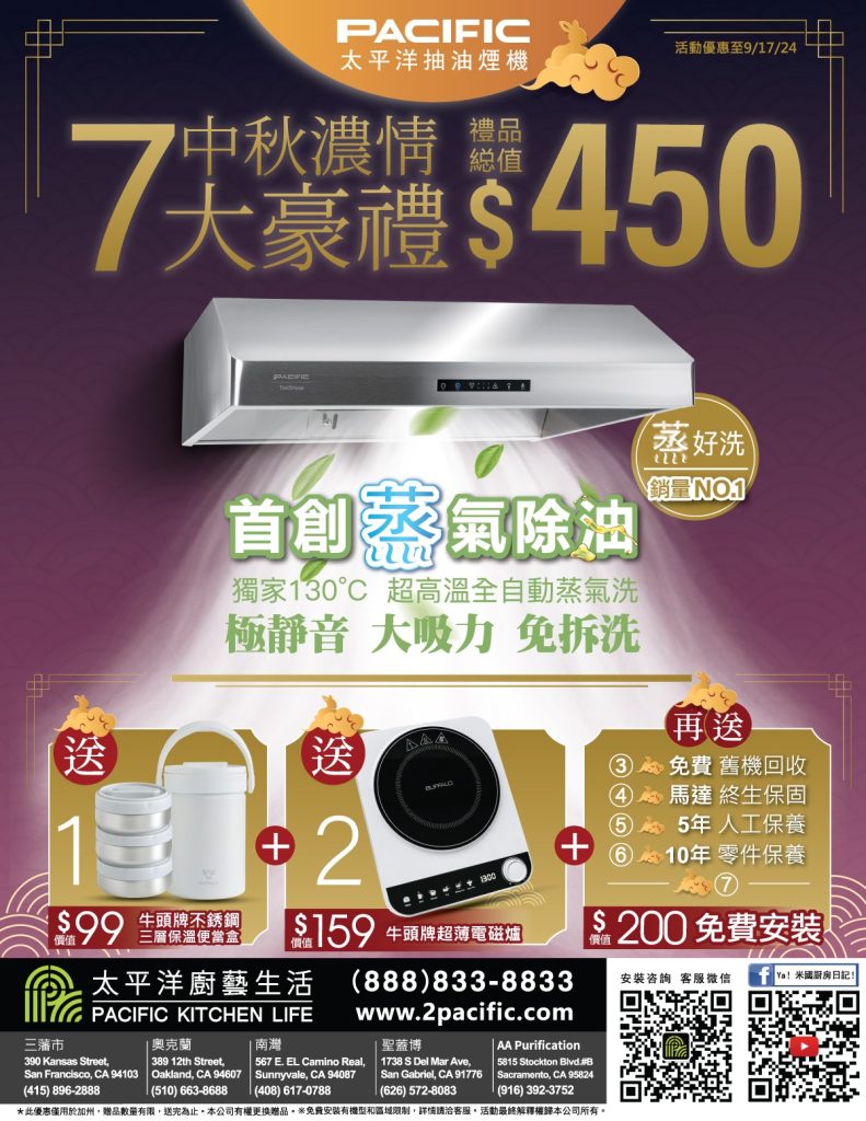 【中秋大促】买太平洋蒸好洗系列最高减$150 !还送牛头牌超薄电磁炉➕不锈钢保温便当桶➕剁手独家礼❗️