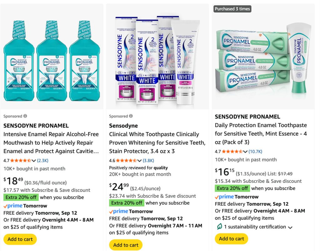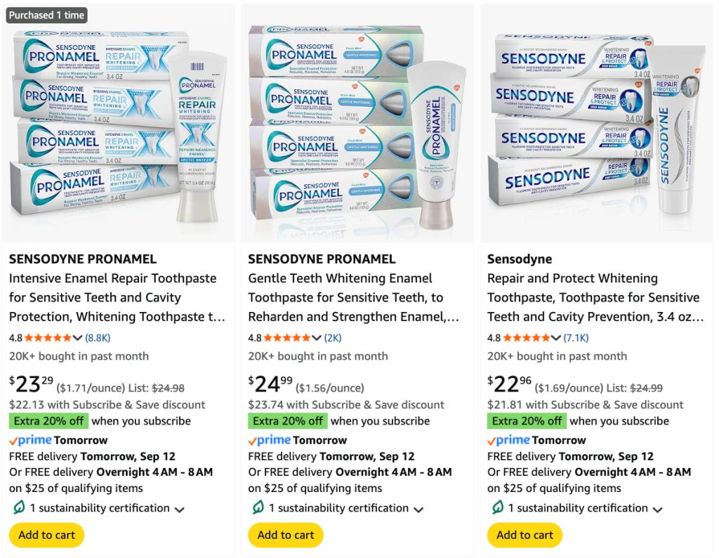 Grocery剁手推荐 一律SS订阅95折➕8折!!多款Sensodyne舒适达牙膏好价囤! By 小ii - September 11, 2025 4:33 pm PDT 舒适达是众多口腔专家建议的专业抗过敏修复牙膏,不仅价格合理,同时可以速效抗敏感,是一款非常受欢迎的脱敏牙膏。如果您的牙齿属于敏感型,吃糖或遇冷热会酸! 那么你一定要买它! SS订阅, 并点击价格下方20% off coupon 点击购买 “文案原创,版权©️剁手,转帖请标明出处,抄袭必究” 剁手Facebook:https://duosho.us/lrp8 广告