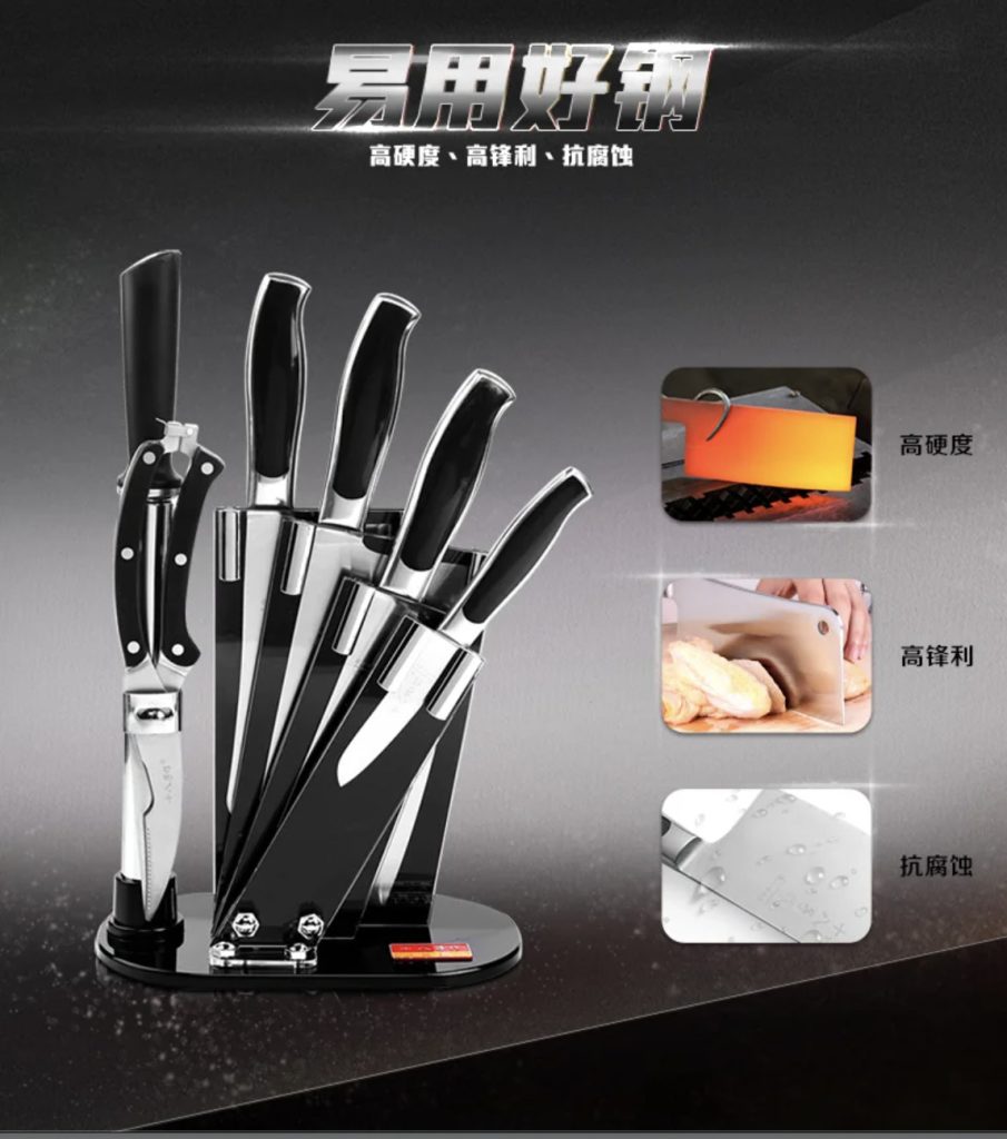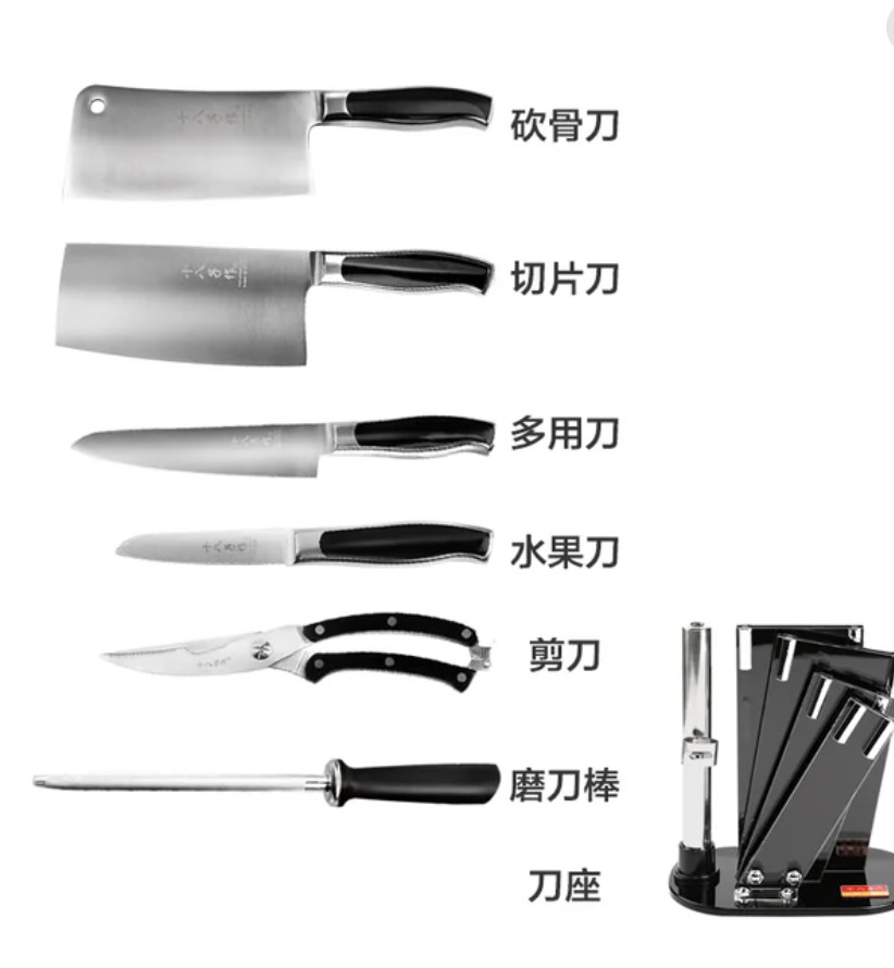 原价$238! 套装包含:砍骨刀、切片刀、多用刀、水果刀、厨房剪、磨刀棒、刀座, 还送磨刀石!甄选5Cr15Mov不锈钢,采用手工湿式开刃,轻松享受锋利!鱼肚手柄设计,符合人体工程学,贴合手掌,握感舒适