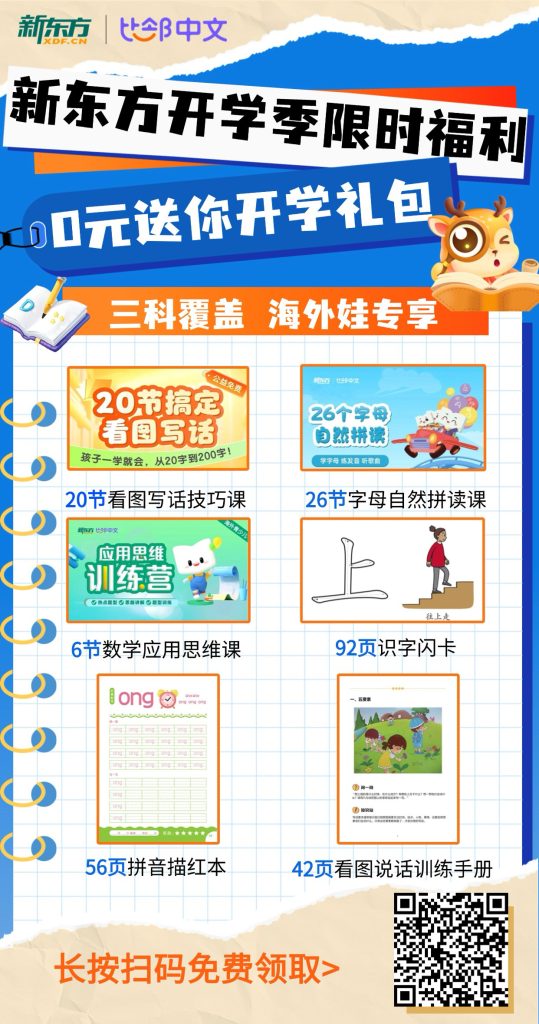 别担心,新东方比邻中文专为海外孩子准备了「开学季0元大礼包」,覆盖语文、英语、数学三大核心学科,帮娃轻松衔接新学期,学习效率up up!