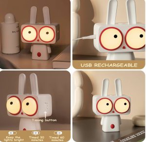 原价$15.99! 短按按钮可以打开/关闭儿童夜灯, 长按按钮可以根据您的需要调节亮度, 自动延时关灯,内置30/60分钟倒计时自动关灯功能, 柔和的灯光可以帮助您消除黑暗中的恐惧,适合在夜晚陪伴您, 不仅适合稳定的睡眠、护理、阅读或工作,还可以在停电或风暴飓风等紧急停电期间作为应急灯, 可通过连接移动电源、笔记本电脑或汽车电源轻松充电, 独特设计可爱的台灯形状像兔子,具有复古风格和高档品质, 它柔和的 LED 光芒和亲切的笑脸使其成为小孩子的绝佳夜灯