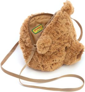 尺寸约6.3×7.1×2.8英寸,坐高6.3英寸,肩带长约46.1英寸。蜂蜜棕毛绒质感柔软,圆耳与绒面鼻细节精致,配坚固拉链与肩带,轻松收纳随身小物。童趣满满,送礼自用都温暖贴心。
