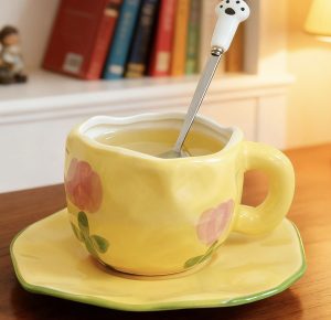 Coffee Mugs Set with Saucer Cute Yellow Tulip Cup Gifts Tea Coffee Mug 250 ML Ceramic Flowers Cup Birthday Gift for Women Girls Mom Friend Coffee Mug