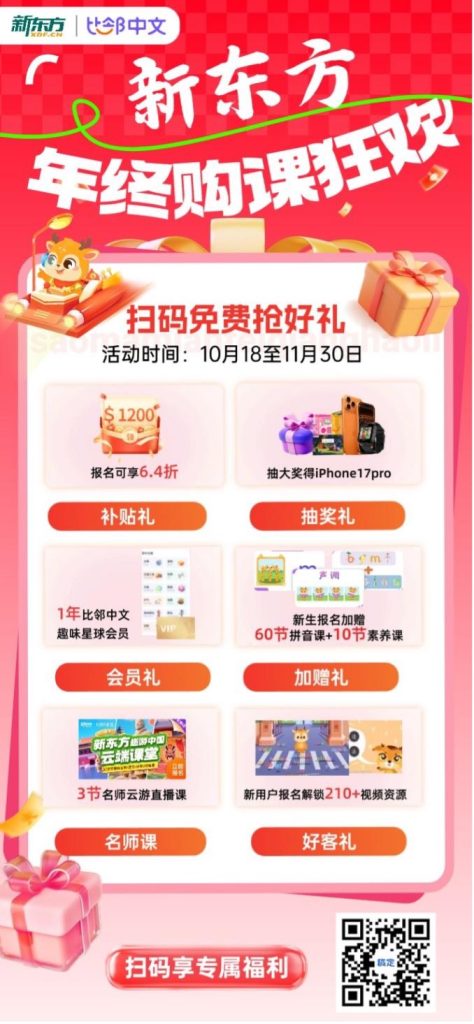 因此,为了让更多海外孩子真正感受到学习中文的魅力,在日常中主动开口与家中长辈说中文,在升学就业上取得显著优势,俞敏洪携手新东方·比邻中文构建了科学的课程体系,让孩子在快乐中学中文!现在还特别推出了「0元试听福利」!