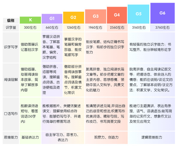依据《3-6岁儿童学习与发展指南》的阶段性目标进行梯度划分,字词选自人民教育出版社制定的《识字、写字教学基本字表》,句型选择依托于《YCT国际汉语能力标准化考试》大纲。