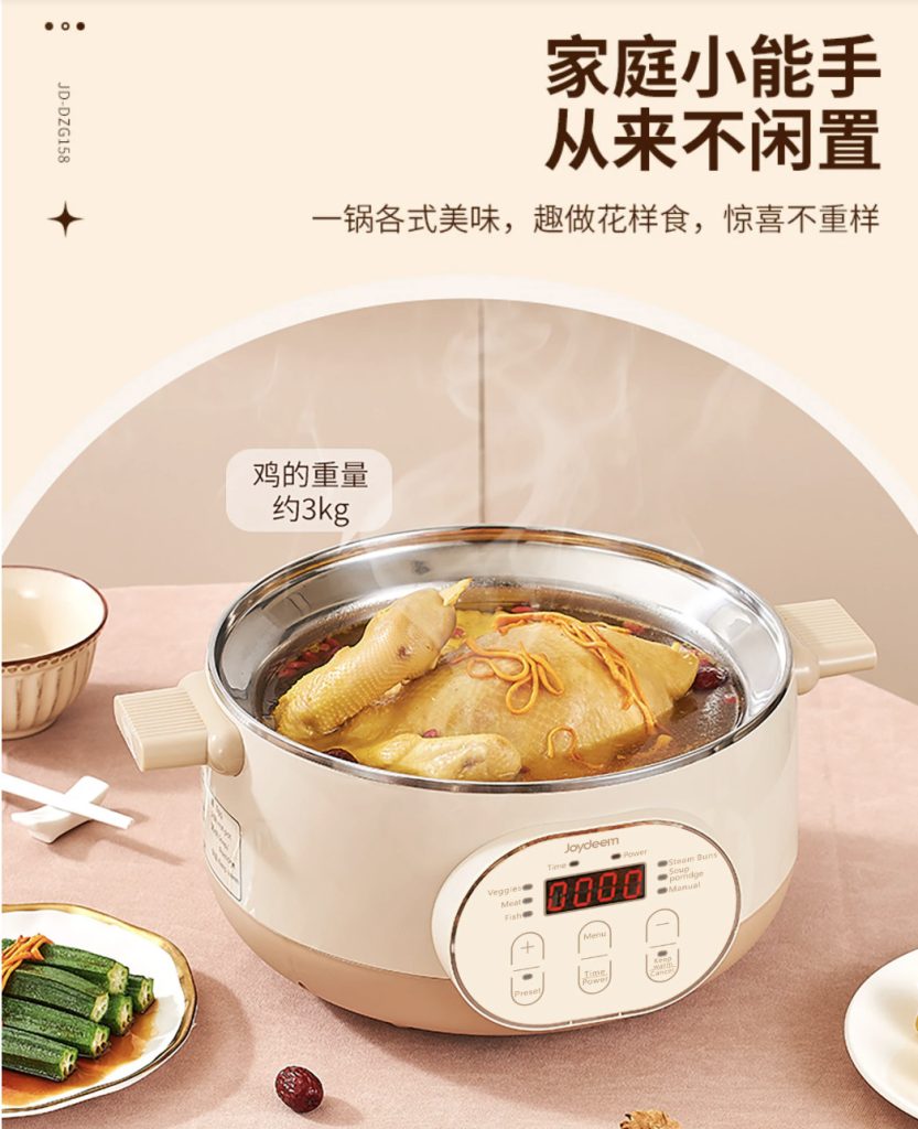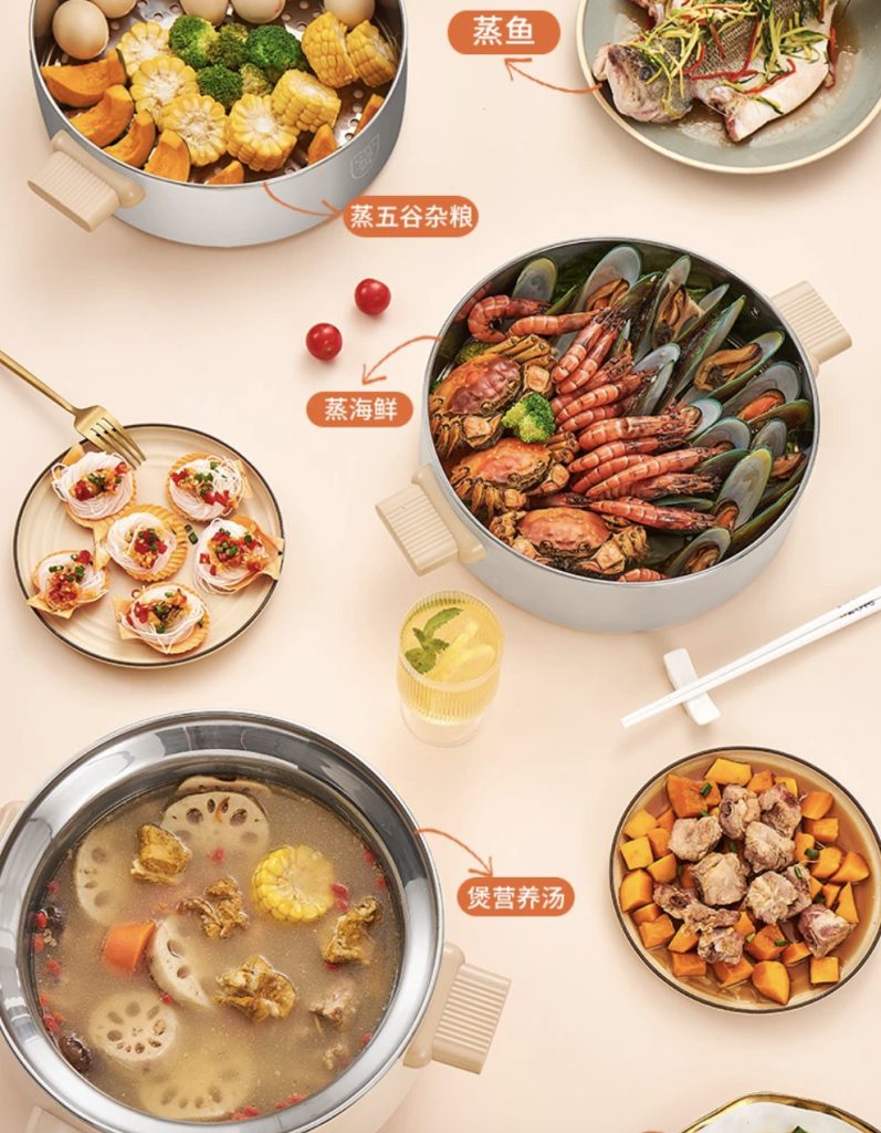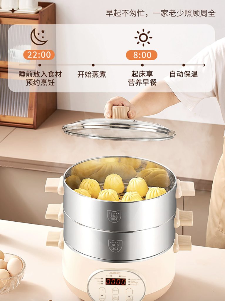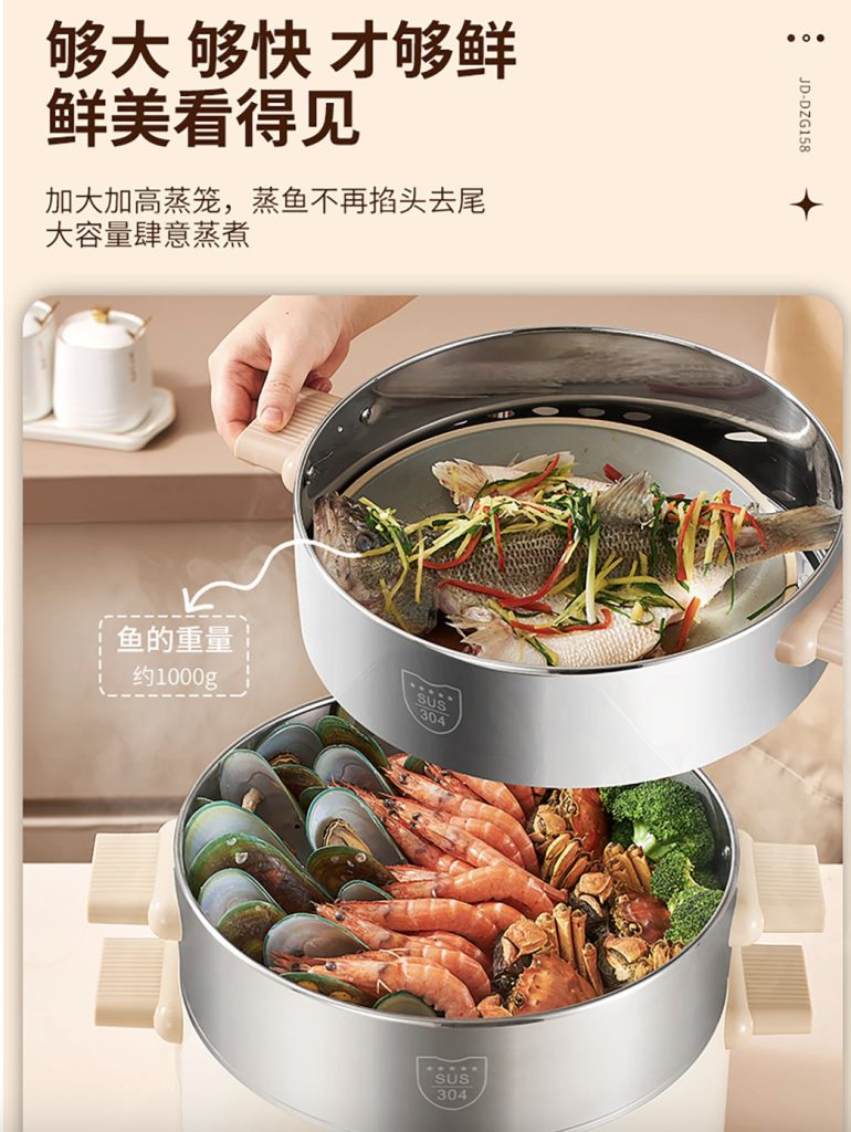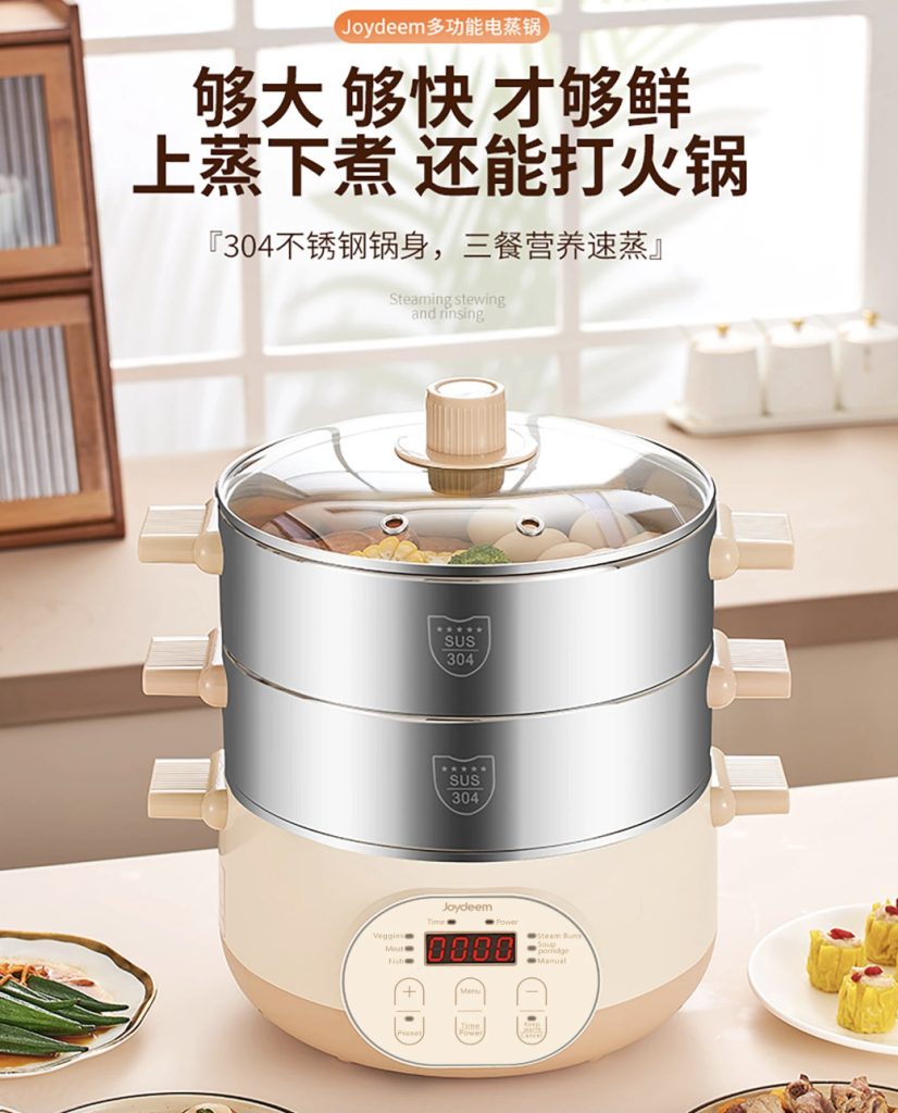 原价$139! 一锅多用,蒸煮涮全能行,一锅尝百味, 优选食品级304不锈钢材质,食物入口更安心, 多层可选,8CM蒸笼,大容量无压力, 6大预设菜单功能,一键烹煮,美味直达, 360°整圈发热,均匀加热,食材快熟不夹生, 双重温控保护,干烧/高温机器自动停止加热, 24小时超长预约,早餐晚汤预约,美味不等待