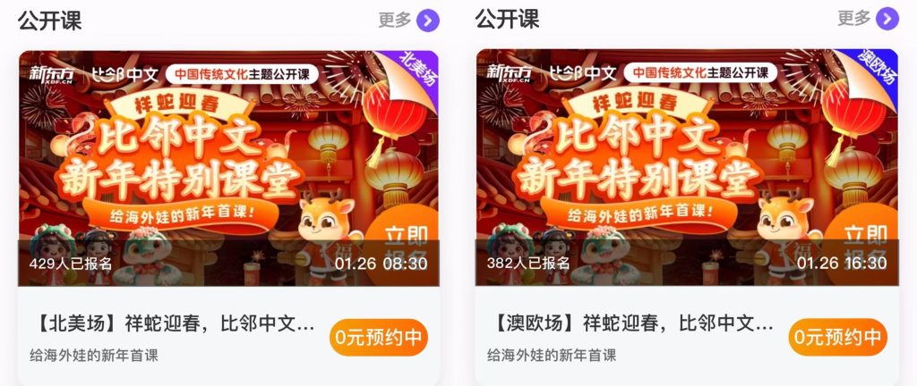 我们还免费送给报名家长2节蛇年系列主题中文直播课,和新东方比邻中文一起云过年!