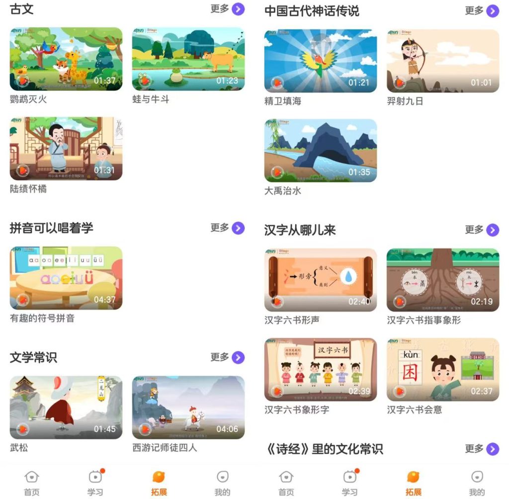 此外,新东方比邻中文还有丰富的视频资源,现在报课还可解锁170+节认识成语、学习拼音、记忆古诗、认识人物等不同主题中文视频课程!