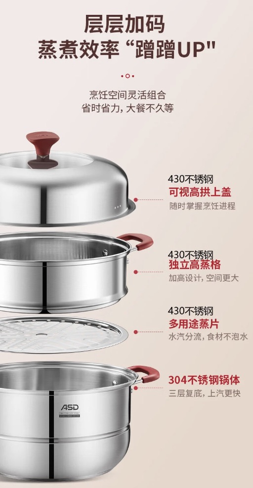 原价$119.99!锅身严选304不锈钢基材,无重金属析出,耐高温,抗腐蚀;三层空间,9.9L超大容量,上蒸下煮,快速省时;可视高拱上盖,随时掌握烹饪进程,独立高蒸格,膨发不顶盖;不串味设计,V形导流槽蒸格,水汽分流,防止浸泡串味,锁住好口感;磁通复合底,拿起就用,不挑炉灶,速导热,匀受热,上汽快;阶梯式内置蒸格,叠放设计,轻松融入厨房一角