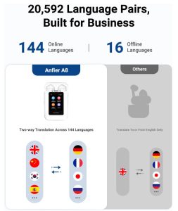 原价$259.99! Anfier A8 搭载AI 技术,支持 144 种语言及口音 实时互译,支持16种主流语言离线使用,无需连接手机App独立使用。内置ChatGPT AI助手,支持耳机翻译及外放翻译,0.5 秒极速响应。配备高通芯片,2英寸触摸屏,支持MP3 & MP4。单次充电支持 5 小时持续翻译,配合充电盒总续航达 35小时,90 分钟即可满电复活。准确率高达 98%,且终身无订阅费!适合商务会议,留学旅行多种场景!