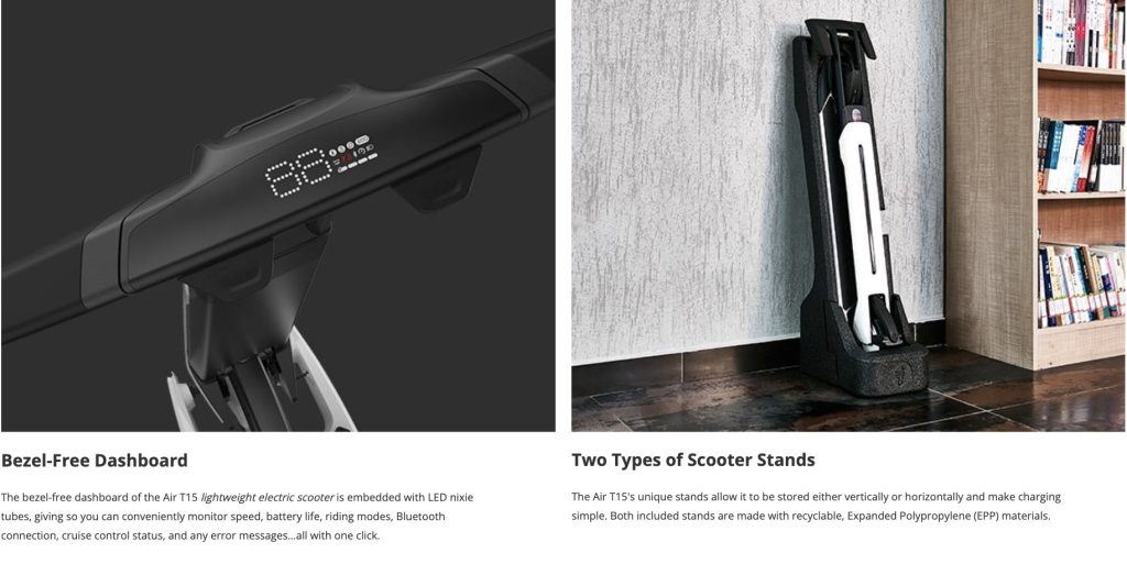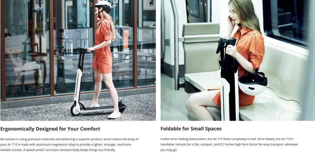 原价$799.99, AirT15 拥有 250W 强劲电机,最高速度为 12.4 英里/小时,行驶里程可达 7.5 英里,最大载重 220 磅! 采用一秒折叠系统,可单手携带。可轻松折叠并存放在汽车或公共交通工具上,是完美的旅行伴侣。Air T15 的车身采用铝镁合金制成,带来更轻便、更可靠的性能,符合人体工程学设计,让您倍感舒适。电子刹车和后挡泥板刹车为您带来双重骑行安全。