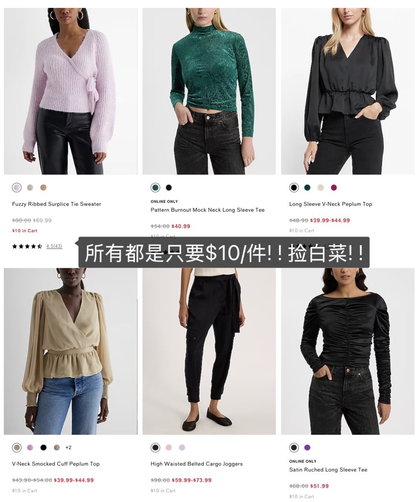 剁手推荐时尚 限时! Express 美衣清仓区骨折价一律$10/件❗️ By 小ii - January 24, 2025 5:55 pm PST 这波折扣也太好了吧! 好多美衣价格一降再降! 日常休闲或者上班通勤风格这里都能找得到~ 一律$10一件捡白菜购物车立减! 建议先filter自己需要的size在进行挑选, 避免选中的款式没号 满$75包邮 女装: 点击购买 男装: 点击购买 “文案原创,版权©️剁手,转帖请标明出处,抄袭必究” 剁手Facebook:https://duosho.us/lrp8 广告