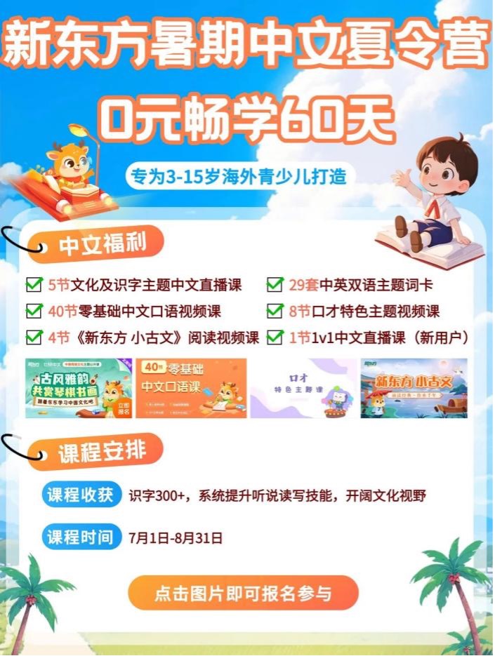 别担心,新东方特别推出了针对3-15岁海外青少儿的暑期中文活动—— 「新东方暑期中文夏令营」!