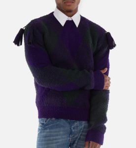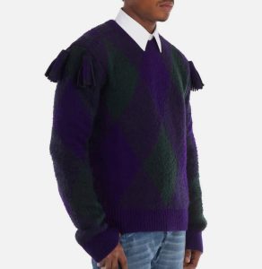 原价$1850!意大利制造100%羊毛,经典钻石纹饰前襟,肩部流苏点缀,长袖宽松版型,罗纹袖口与下摆设计,柔软中厚面料兼具舒适与时尚感,是秋冬必备精品毛衣。