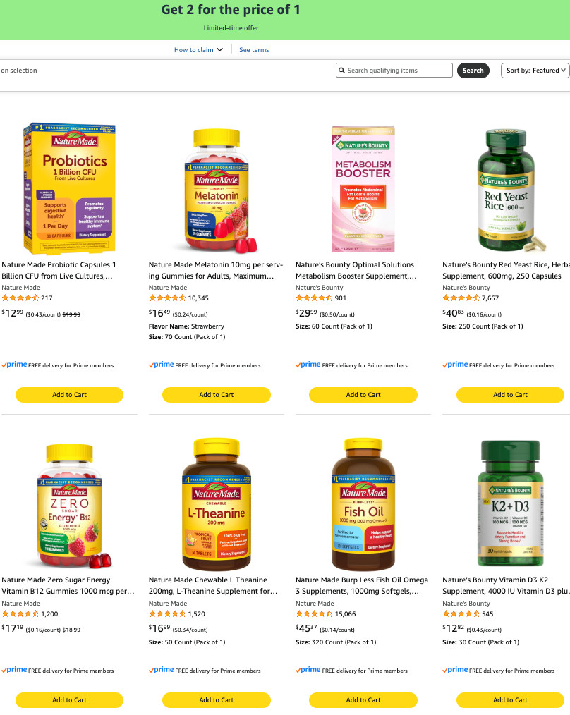 Grocery剁手推荐 Amazon现有精选保健品买一送一! 送自己和长辈一份健康 By 小ii - September 29, 2025 6:27 pm PDT 都是家喻户晓的大牌如Nature Made, Nature Bounty等. 送自己, 送长辈必备! 可mix and match, 加两瓶进购物车结账最后一步立减 Prime包邮 点击购买 “文案原创,版权©️剁手,转帖请标明出处,抄袭必究” 剁手Facebook:https://duosho.us/lrp8 广告