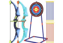 原价$49.99! 弓箭套装配有可拆卸的靶架、2 把夜光弓和 14 支吸盘箭。适合 5-7 8-12 岁儿童的理想弓箭玩具!优质弹性材料确保其坚固耐用,不易折断, 配有独特的 LED 灯,是黑暗或低光房间的理想儿童玩具, 支持两种模式:立式靶和壁挂式,易于安装和携带,让孩子们无论在室内还是室外,都能享受瞄准和射击的乐趣