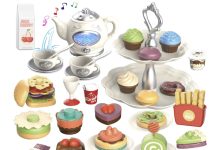 原价$25.99!装包括1个带音乐和灯光的茶壶、4个茶杯、2个盘子和2个碟子、16个甜点(甜甜圈、蛋糕、马卡龙、饼干等)、2层蛋糕架、3份快餐玩具(汉堡、馅饼、薯条)以及一些果汁饮料。