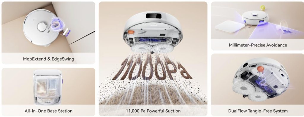 DualFlow 防缠绕系统+单滚刷设计,强力吸起灰尘和毛发,侧刷可自动切换形状